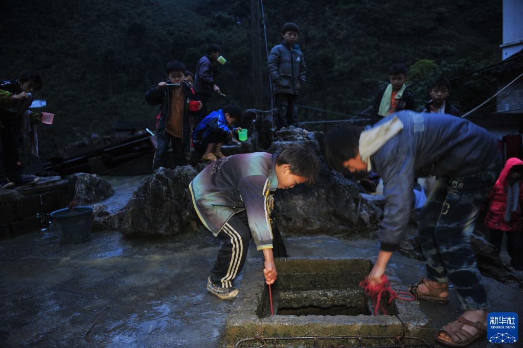 在廣西大化瑤族自治縣板升鄉弄勇小學(xué),同學(xué)們從水柜里提水洗漱(2012年12月26日攝)。