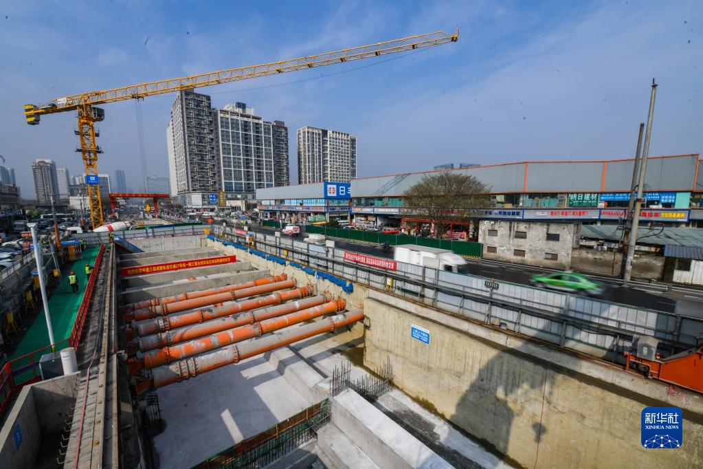 這是3月21日在成都地鐵27號線(xiàn)金府站拍攝的車(chē)站主體結構封頂施工現場(chǎng)。
