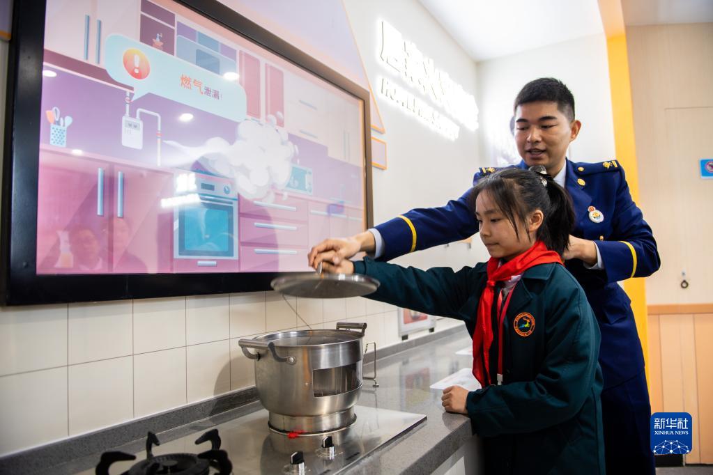 3月21日,在常德市科技館,消防員為學(xué)生講解廚房火災處置。