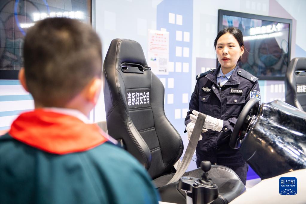 3月21日,在常德市科技館,交警為學(xué)生們介紹汽車(chē)安全帶使用方法。