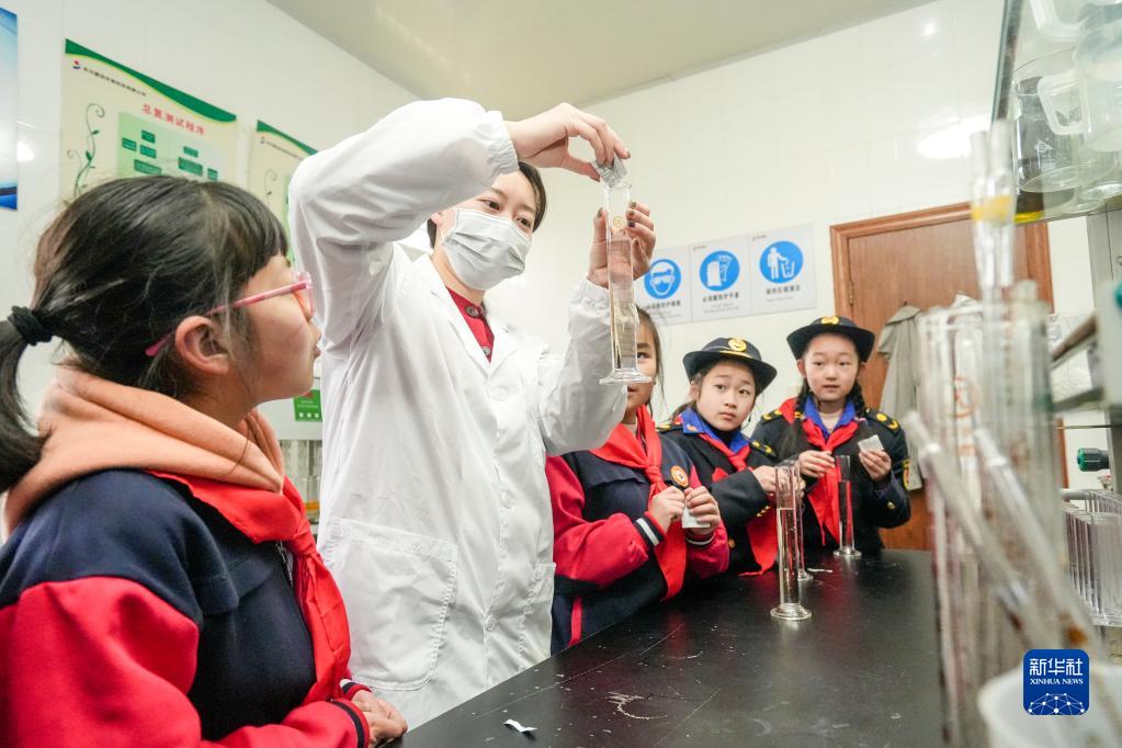 3月21日,在浙江省湖州市長(cháng)興縣煤山鎮污水處理廠(chǎng),煤山中心小學(xué)的學(xué)生在體驗凈化水質(zhì)實(shí)驗。