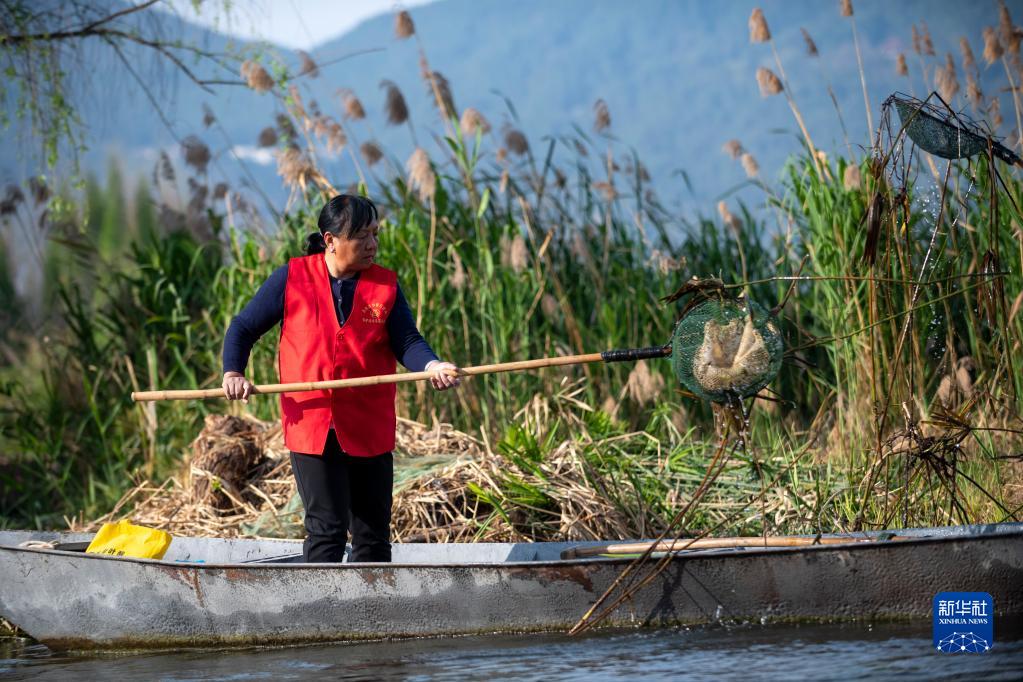 3月20日,李云麗在滇池草海打撈枯枝等。