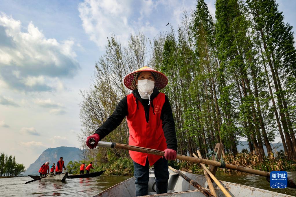 3月20日,巾幗打撈隊一名隊員搖槳前往打撈區域。