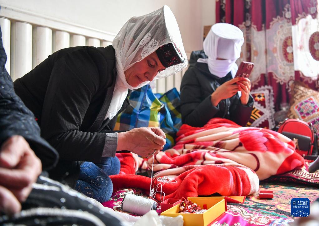 新娘古麗汗·贊加比力的長(cháng)輩在為她準備婚禮儀式上需要穿戴的飾品(3月18日攝)。