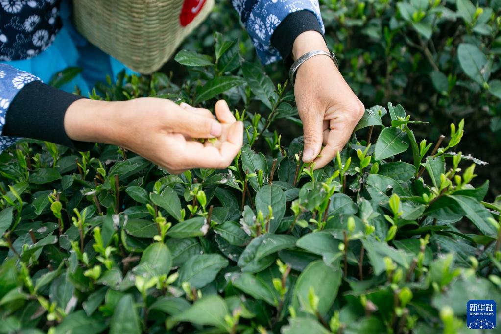 3月22日,在重慶市永川區永榮鎮鄉村振興就業(yè)園,采茶工在采摘茶葉。