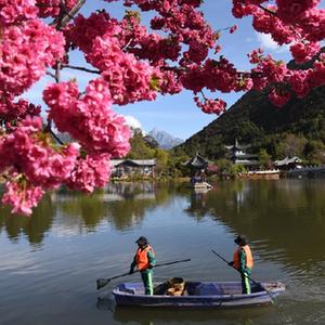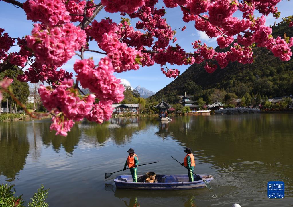 3月22日,在云南省麗江市古城區黑龍潭公園,環(huán)衛工人在打撈水面垃圾。