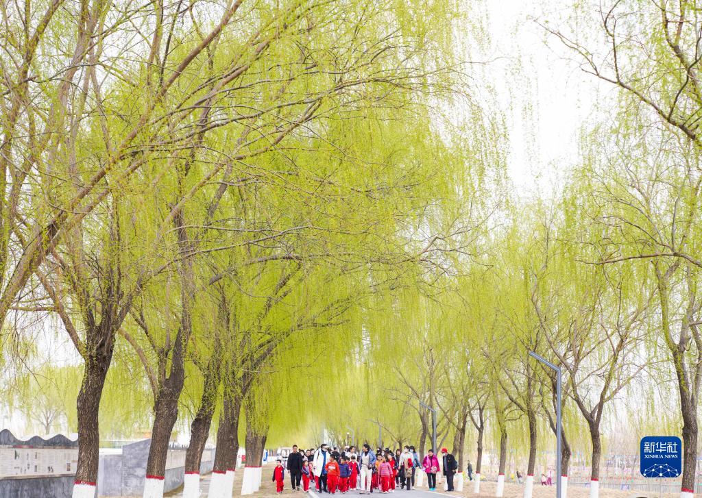 3月18日,山東省鄒平市第二實(shí)驗小學(xué)的學(xué)生在黃河臺子段大堤上賞柳游玩。