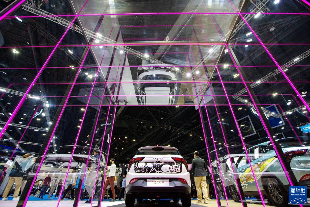 3月22日,觀(guān)眾在泰國曼谷國際車(chē)展上參觀(guān)哪吒V汽車(chē)。