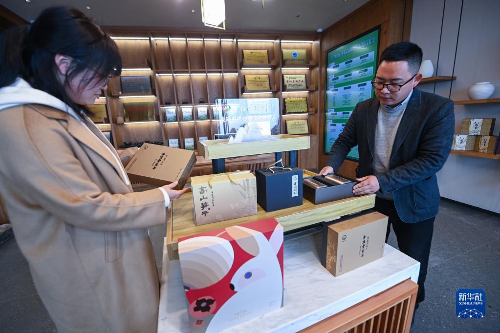 3月23日,在里山鎮安頂村的安頂云霧共富集市內,回鄉創(chuàng )業(yè)的新鄉賢夏燕龍(右)與鎮干部一起把特色農產(chǎn)品擺放上架,方便游客選購。