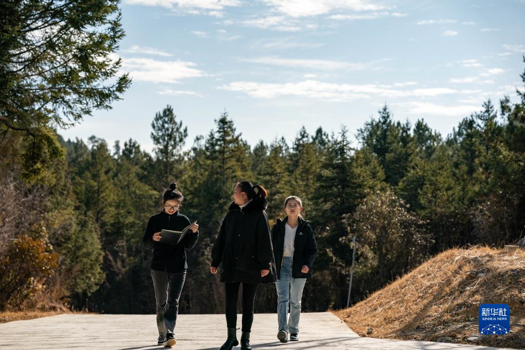 工作人員彭小清(中)和李曉莉(左)、殷鉞淼前往香格里拉國家大氣本底站大氣成分業(yè)務(wù)用房(3月9日攝)。