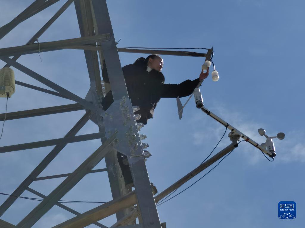 工作人員彭小清在香格里拉國家大氣本底站巡查鐵塔溫室氣體10米進(jìn)氣口(3月9日攝)。
