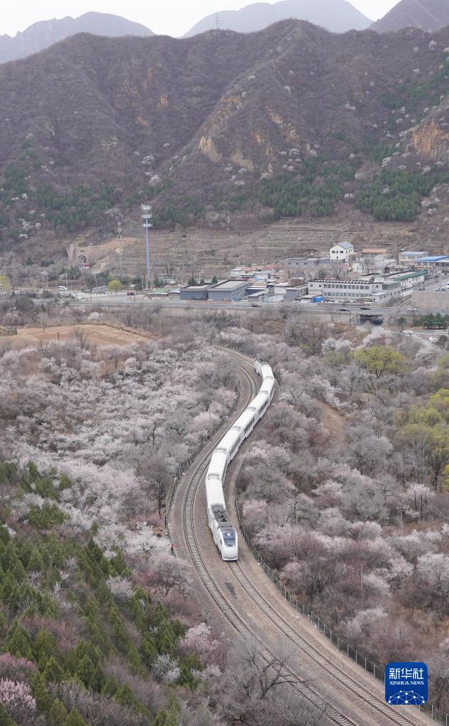 3月23日,一列S2線(xiàn)列車(chē)行駛在居庸關(guān)長(cháng)城腳下花海中。