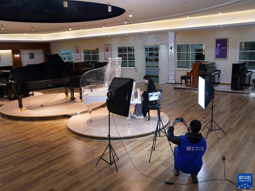 3月23日,德清縣洛舍鎮東衡村一家鋼琴制造企業(yè)的工作人員進(jìn)行直播推介。