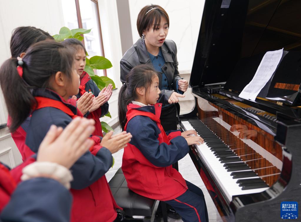 3月23日,德清縣洛舍鎮中心學(xué)校的小學(xué)生在鋼琴小鎮的展示館內彈奏鋼琴。