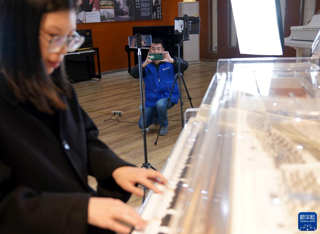 3月23日,德清縣洛舍鎮東衡村一家鋼琴制造企業(yè)的工作人員進(jìn)行直播推介。