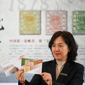這是紀念中國近代郵政試辦145周年發(fā)行的紀念封和明信片(3月23日攝)。