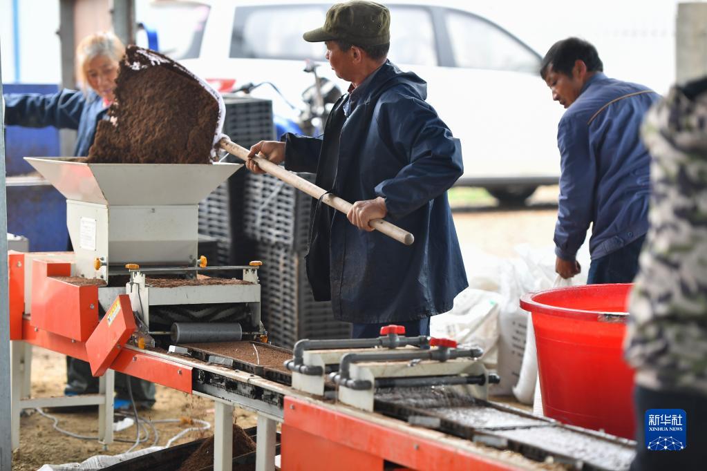 3月23日,在湘潭市雨湖區姜畬鎮青亭村,農民使用水稻秧盤(pán)育秧播種機制作秧盤(pán)。
