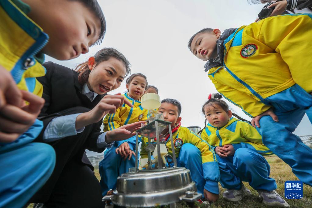 3月23日,工作人員在貴州省銅仁市玉屏侗族自治縣氣象局為小朋友介紹氣象知識。