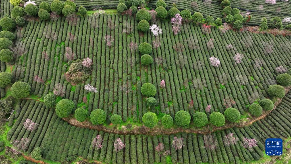 3月23日拍攝的鳳岡縣永安鎮田壩社區生態(tài)茶園基地(無(wú)人機照片)。