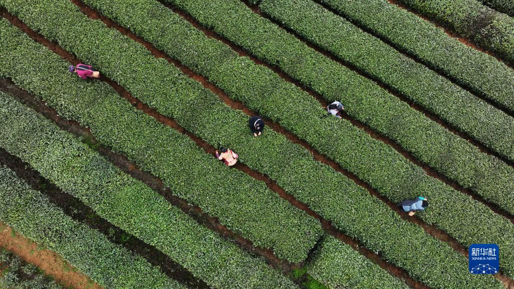 3月23日,村民在鳳岡縣永安鎮田壩社區生態(tài)茶園基地采摘春茶(無(wú)人機照片)。
