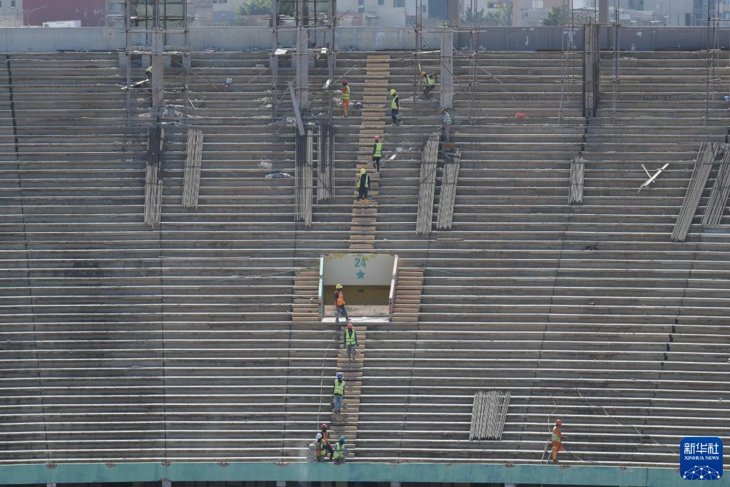 3月22日,工人在塞內加爾首都達喀爾的桑戈爾體育場(chǎng)施工。