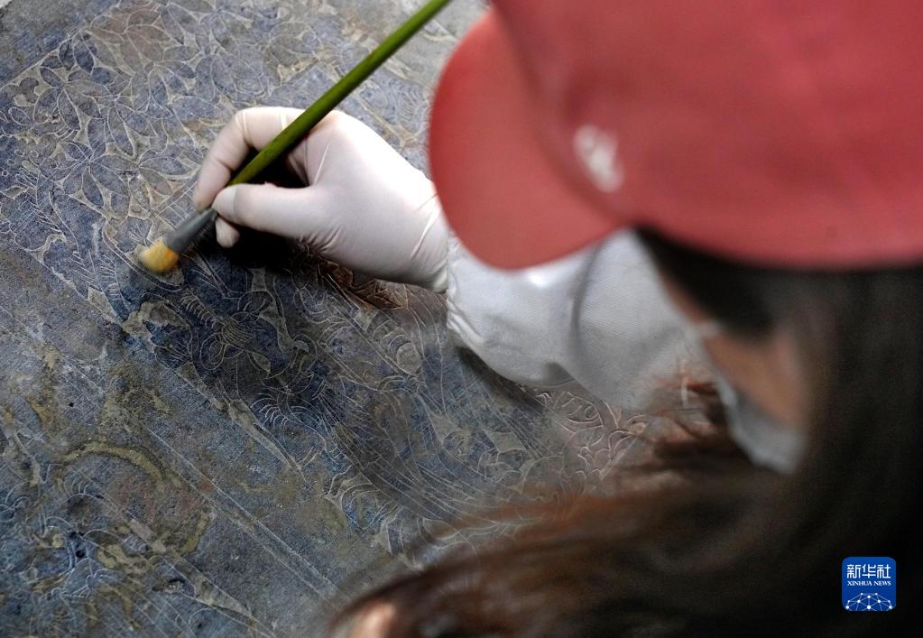 工作人員在清理圍屏石棺床石屏風(fēng)上的圖像(3月15日攝)。