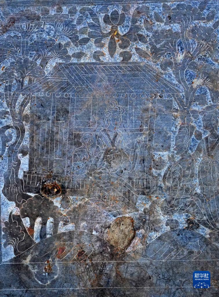 這是圍屏石棺床石屏風(fēng)上的圖像(3月15日攝)。