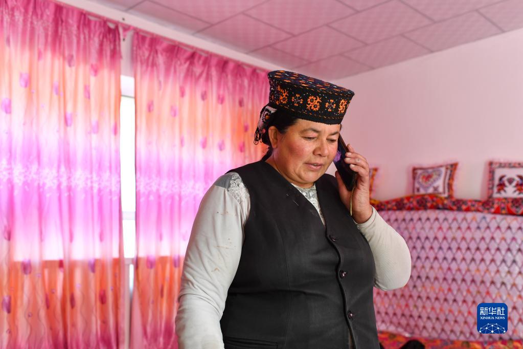 那尼克·苦卡尼在家中給在外工作的丈夫都熱·加爾曼打電話(huà)(2019年11月25日攝)。搬遷前,都熱家如果需要給在縣城的親戚打電話(huà),只能到鄉政府所在地。