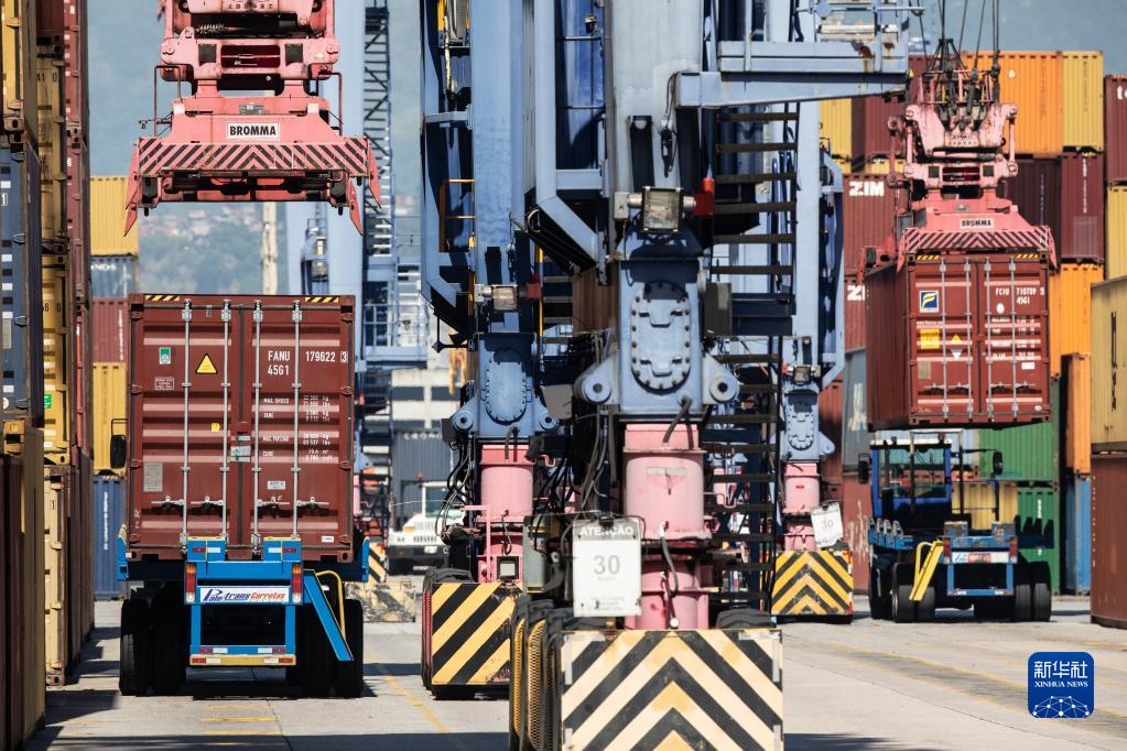 3月20日,在巴西里約熱內盧港一處集裝箱碼頭,工程機械進(jìn)行裝卸貨作業(yè)。