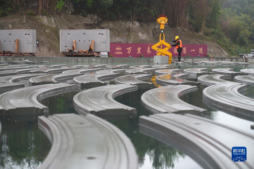 3月24日,在中鐵十四局重黔鐵路管片場(chǎng),工人在水養池進(jìn)行管片入水養護作業(yè)。