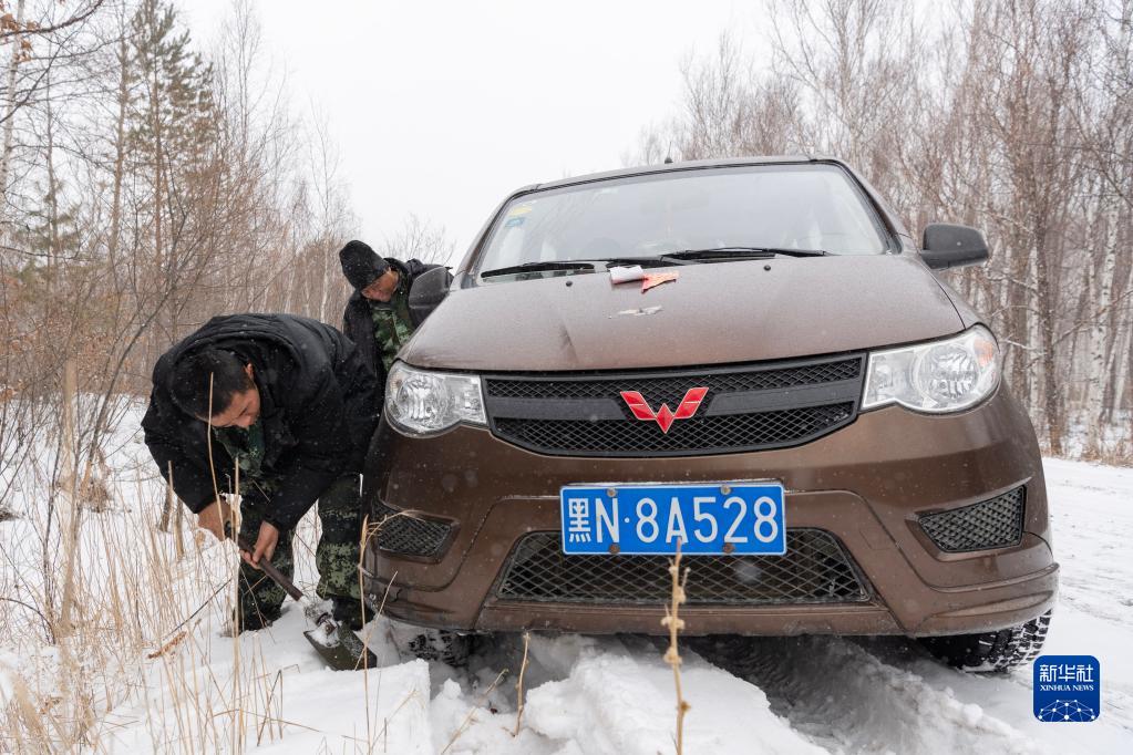 3月22日,在中國龍江森工集團沾河林業(yè)局有限公司施業(yè)區,車(chē)輛在進(jìn)山途中掉入路邊溝中,王劉洋(前)和王學(xué)堂下車(chē)處理。