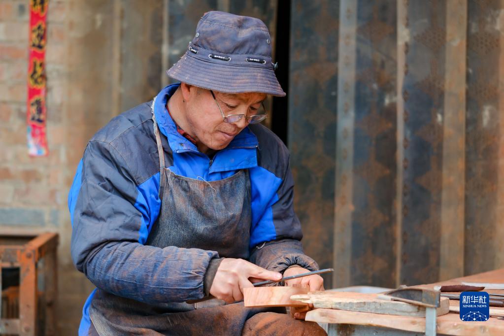 3月25日,村民在徐場(chǎng)村一處民族樂(lè )器家庭作坊里制作琵琶。