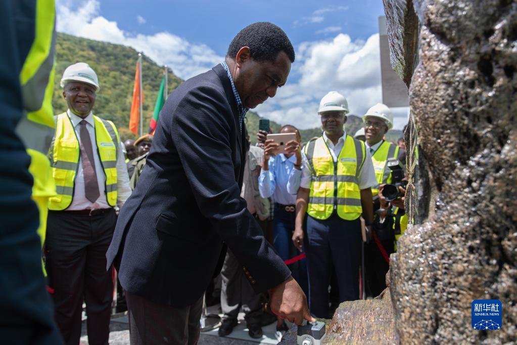 3月24日,在贊比亞南方省,贊比亞總統哈凱恩德·希奇萊馬為下凱富峽水電站5號機組按下啟動(dòng)按鈕。