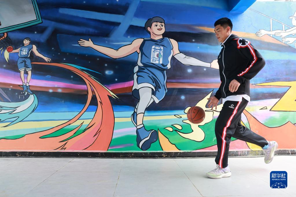 3月25日,一名籃球愛(ài)好者進(jìn)入“村BA”比賽現場(chǎng)。