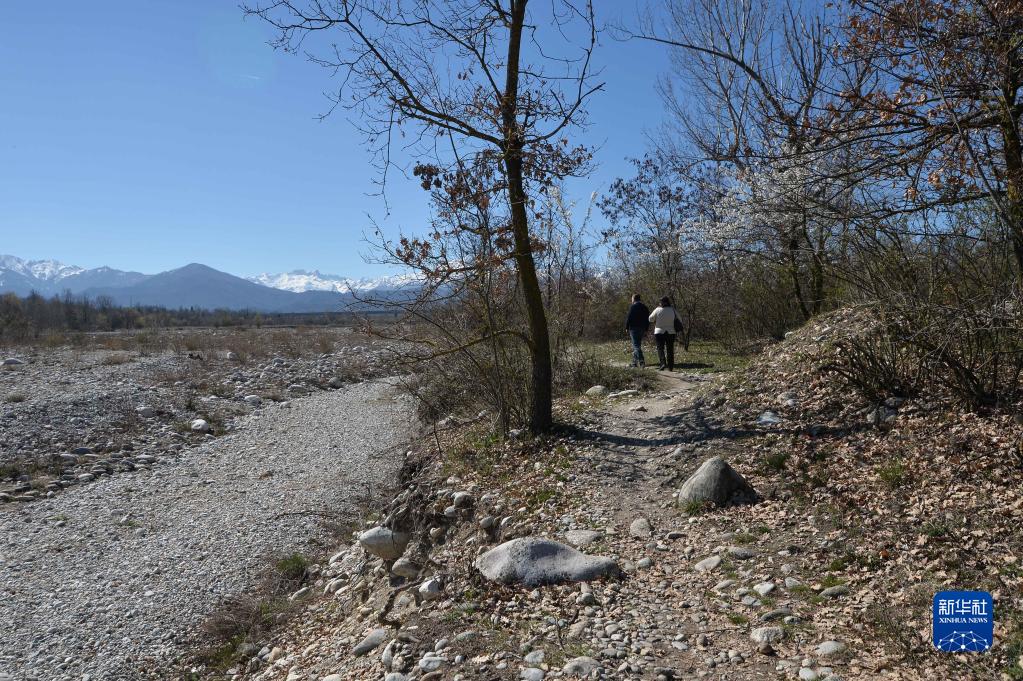 3月25日,在意大利皮埃蒙特大區,人們走在干涸的杰索河河床附近。