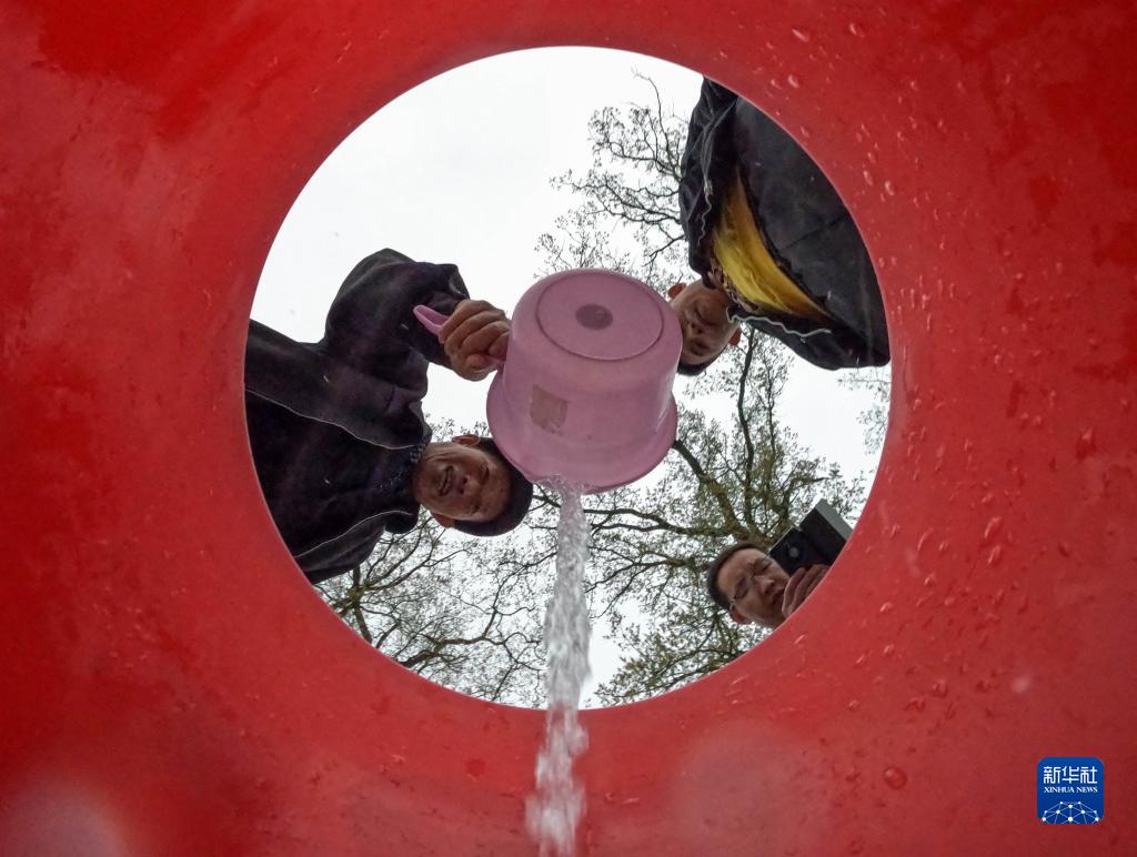 在龍里縣冠山街道高坪村,管水員陳光明(左)將自來(lái)水倒入桶中(3月23日攝)。