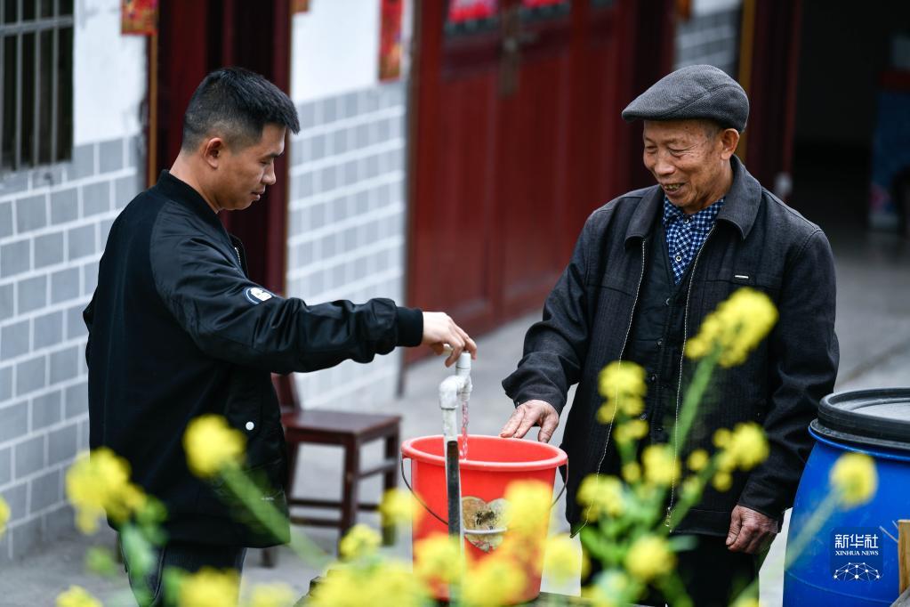 在龍里縣冠山街道高坪村,管水員陳光明(右)查看村民家自來(lái)水水質(zhì)(3月23日攝)。