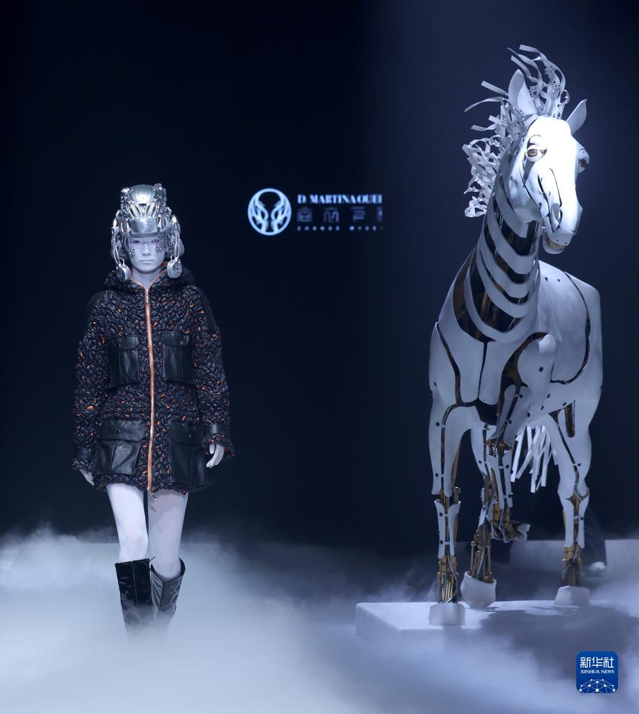 當日,主題為“視界·邊界”的時(shí)裝秀在北京舉行的中國國際時(shí)裝周2023秋冬系列上上演。設計師丁潔以婦好鸮尊為設計靈感,模特佩戴3D打印發(fā)飾,繞行秀場(chǎng)特別設置的“戰馬”,上演了一場(chǎng)歷史與未來(lái)“時(shí)空對話(huà)”的時(shí)裝秀。