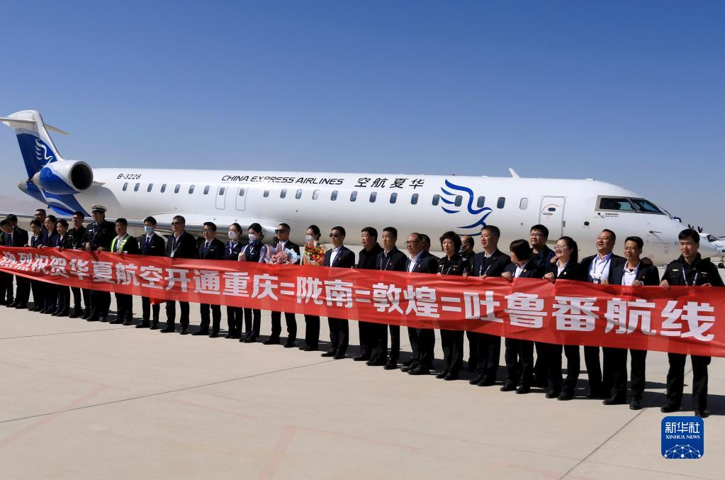 3月26日,由華夏航空執飛的重慶-隴南-敦煌-吐魯番往返航線(xiàn)正式通航,這是首航航班機組人員與機場(chǎng)工作人員在甘肅敦煌莫高國際機場(chǎng)合影。