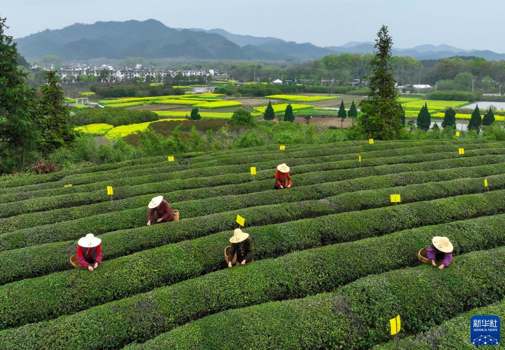 3月27日,茶農在安徽省黃山市徽州區潛口鎮坤沙村采摘黃山毛峰鮮葉(無(wú)人機照片)。