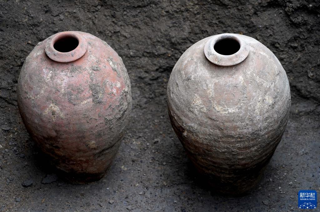 這是宋國故城遺址內的唐代墓葬出土的陶罐(3月25日攝)。新華社記者 李安 攝