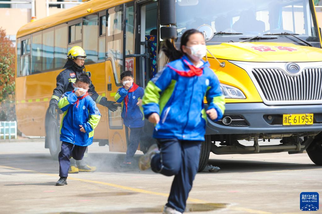 3月27日,浙江省湖州市德清縣三合中心學(xué)校學(xué)生在消防員的指導下進(jìn)行校車(chē)應急逃生演練。