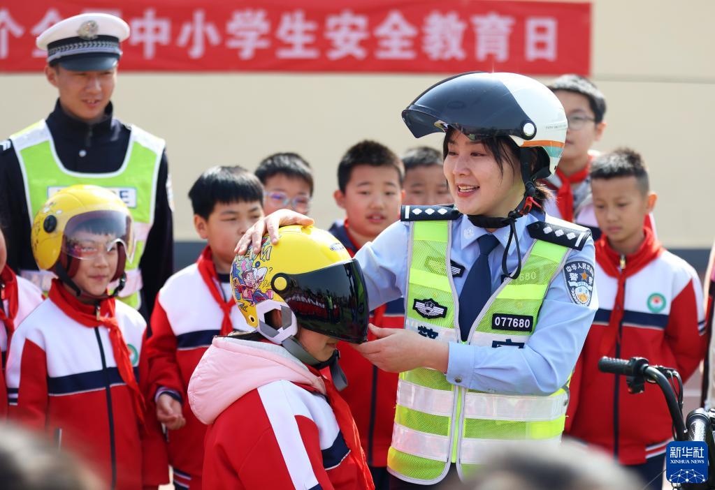 3月27日,在山東省郯城縣東方紅小學(xué),民警在為小學(xué)生講解佩戴頭盔的重要性。