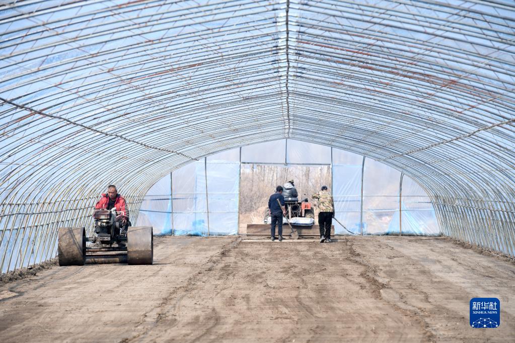 在海林市海林鎮新合村水稻育秧示范基地,工作人員在水稻育秧大棚中平整土地(3月27日攝)。