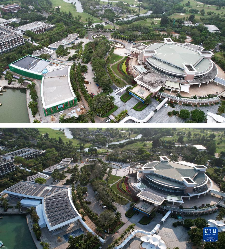 這是一張拼版照片:上圖為博鰲零碳示范區內改造前的博鰲亞洲論壇國際會(huì )議中心(右)和博鰲亞洲論壇新聞中心(1月12日攝,無(wú)人機照片);下圖為改造后的博鰲亞洲論壇國際會(huì )議中心和博鰲亞洲論壇新聞中心(3月14日攝,無(wú)人機照片)。