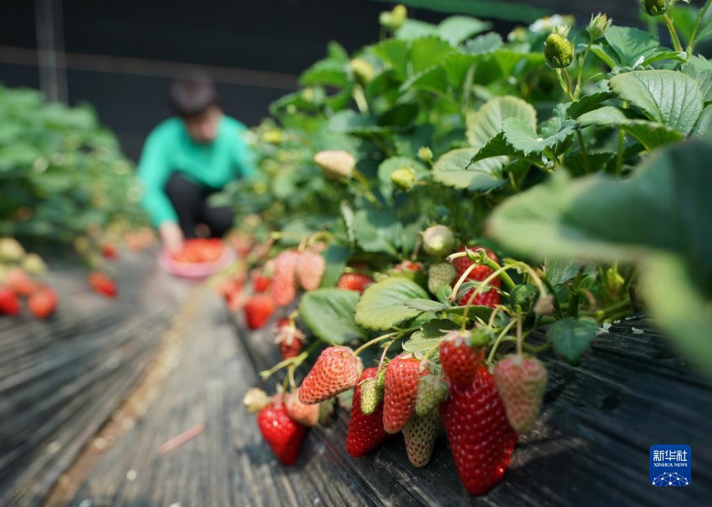 3月28日,游客在秦皇島市海港區海陽(yáng)鎮一家庭農場(chǎng)的大棚內采摘草莓。