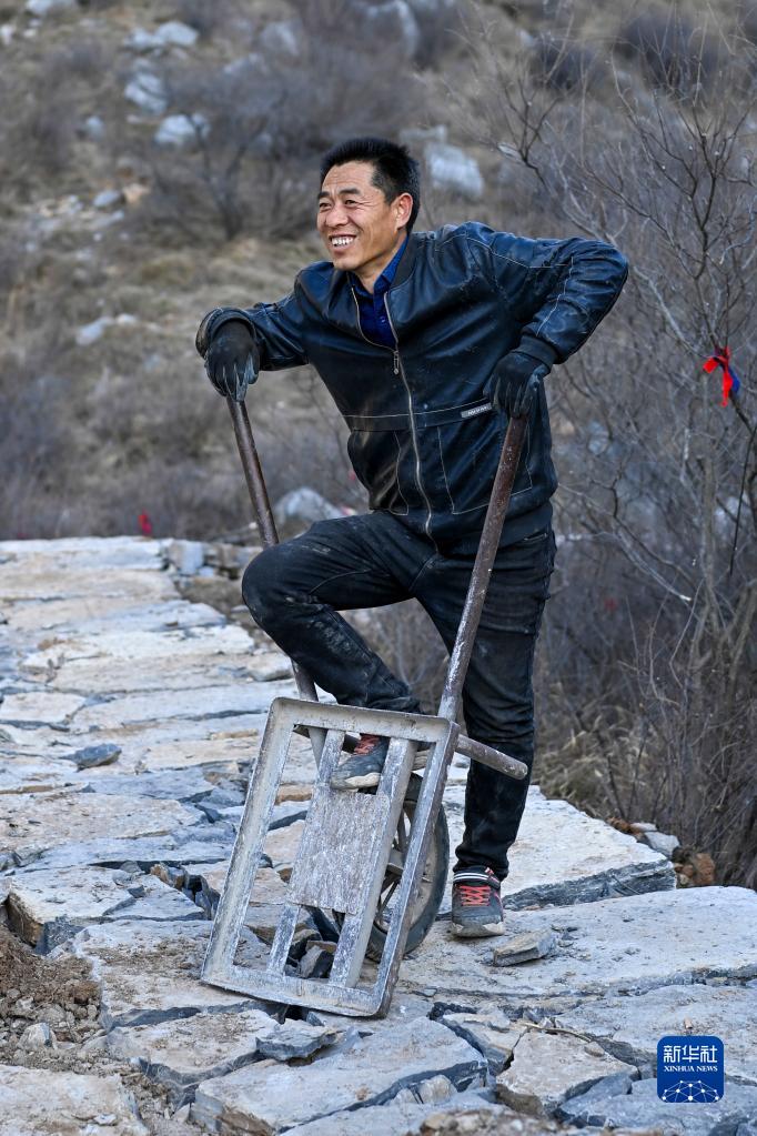 在位于山西省壺關(guān)縣大峽谷鎮青龍峽村的太行山上,牛何松在修路間隙休息(3月7日攝)。新華社記者 楊晨光 攝