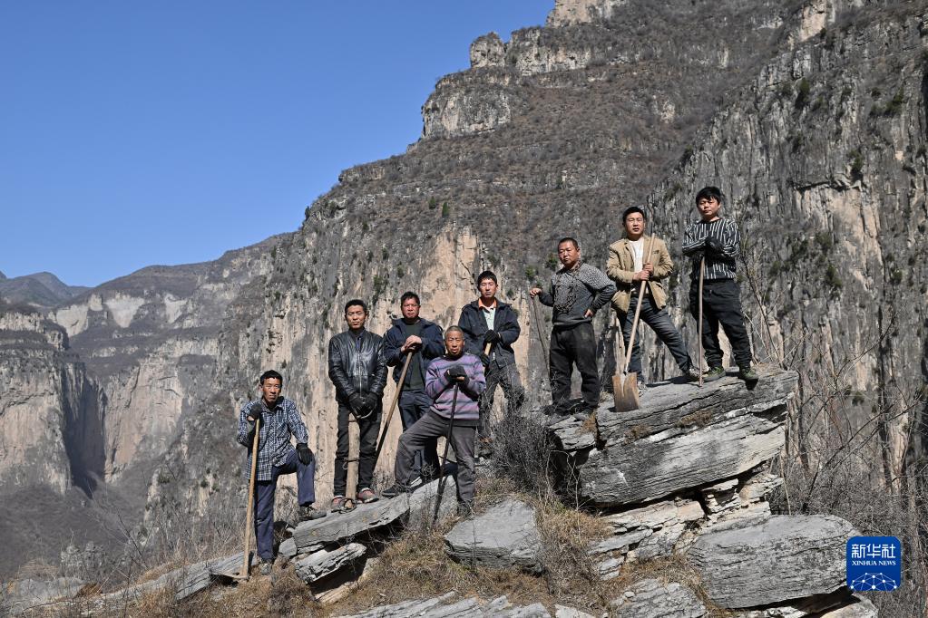 修路的部分村民在山上合影,從左至右為王春勤、牛何松、張衛國、王成生、牛麗朋、牛永剛、申森、?;蹌P(3月8日攝)。新華社記者 詹彥 攝
