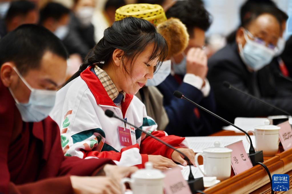 3月28日,拉薩中學(xué)高二學(xué)生洛巴(左二)參加慶祝西藏百萬(wàn)農奴解放64周年座談會(huì )時(shí)發(fā)言。