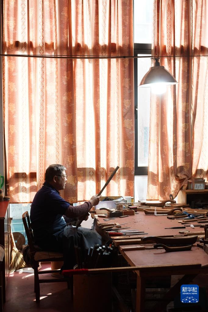 3月28日,在江蘇無(wú)錫梅村街道二胡產(chǎn)業(yè)園古月琴坊車(chē)間,工人在制作二胡。